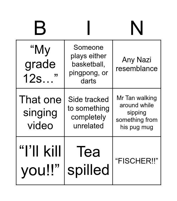 This bingo card has 9 words: “I’ll kill you!!”, Any Nazi resemblance, Someone plays either basketball, pingpong, or darts, That one singing video, “My grade 12s…”, Mr Tan walking around while sipping something from his pug mug, Side tracked to something completely unrelated, “FISCHER!!” and Tea spilled.