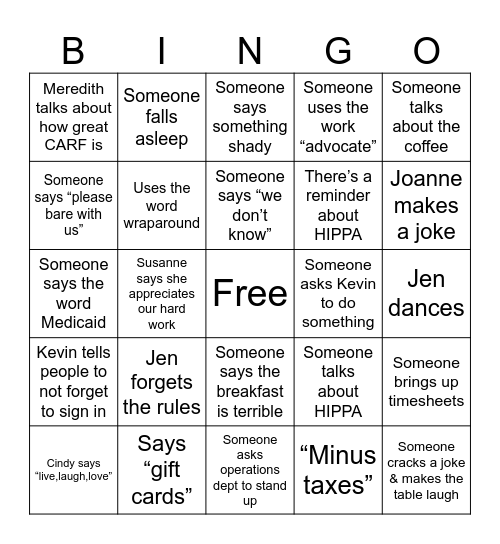 This bingo card has a free space and 24 words: Cindy says “live,laugh,love”, Jen forgets the rules, Someone says “we don’t know”, “Minus taxes”, Someone talks about the coffee, Meredith talks about how great CARF is, Someone falls asleep, Someone says something shady, Someone asks Kevin to do something, Jen dances, Someone says the word Medicaid, Uses the word wraparound, Someone talks about HIPPA, Someone brings up timesheets, Someone says “please bare with us”, Says “gift cards”, Someone asks operations dept to stand up, Someone uses the work “advocate”, Joanne makes a joke, Kevin tells people to not forget to sign in, Susanne says she appreciates our hard work, Someone says the breakfast is terrible, There’s a reminder about HIPPA and Someone cracks a joke & makes the table laugh.