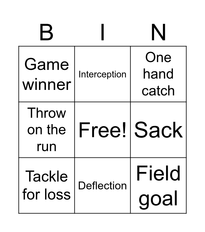 This bingo card has a free space and 8 words: Sack, One hand catch, Interception, Tackle for loss, Game winner, Field goal, Throw on the run and Deflection.