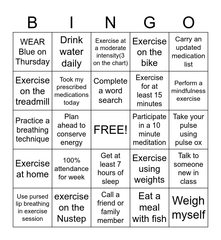 This bingo card has a free space and 24 words: 100% attendance for week, exercise on the Nustep, Complete a word search, Use pursed lip breathing in exercise session, Carry an updated medication list, WEAR Blue on Thursday, Exercise on the treadmill, Drink water daily, Participate in a 10 minute meditation, Get at least 7 hours of sleep, Exercise for at least 15 minutes, Practice a breathing technique, Exercise using weights, Talk to someone new in class, Took my prescribed medications today, Eat a meal with fish, Take your pulse using pulse ox, Exercise at a moderate intensity(3 on the chart), Perform a mindfulness exercise, Plan ahead to conserve energy, Weigh myself, Exercise at home, Exercise on the bike and Call a friend or family member.