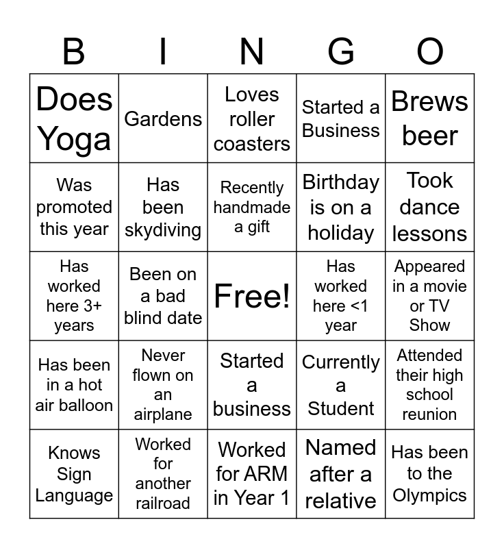 This bingo card has a free space and 29 words: Knows Sign Language, Knows how to surf, Been on a bad blind date, Been to Disney this year, Does Yoga, Loves roller coasters, Has been skydiving, Never flown on an airplane, Has worked here <1 year, Worked for another railroad, Appeared in a movie or TV Show, Has been to the Olympics, Worked for ARM in Year 1, Named after a relative, Took dance lessons, Is a Notary public, Started a business, Has been in a hot air balloon, Brews beer, Has worked here 3+ years, Currently a Student, Loves Karaoke, Birthday is on a holiday, Was promoted this year, Started a Business, Gardens, Attended their high school reunion, Recently handmade a gift and Loves true crime podcasts.