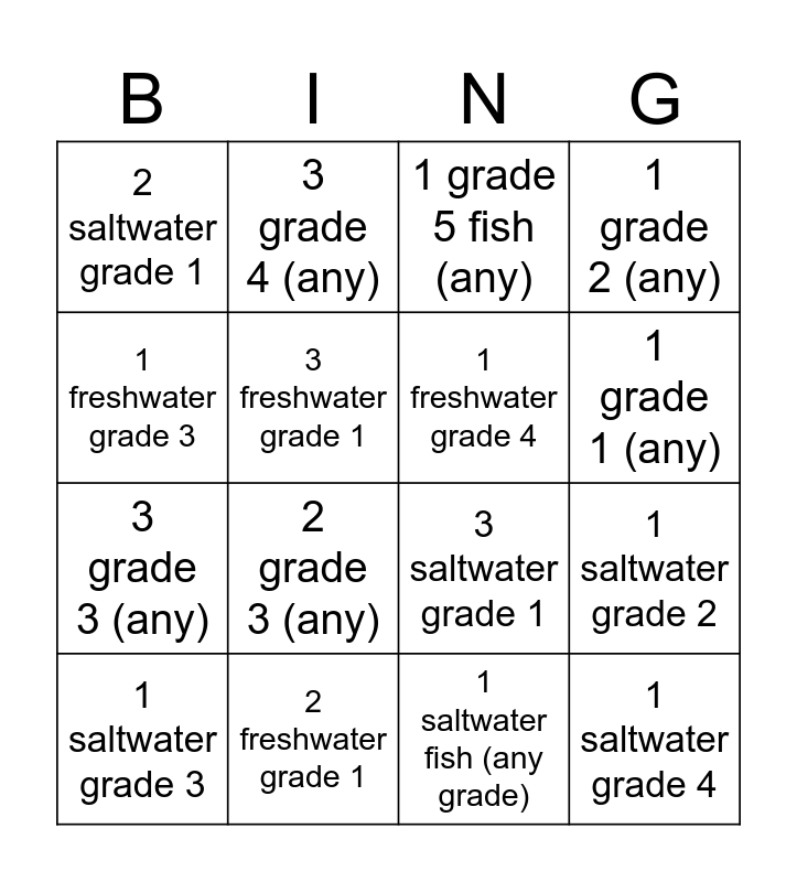 This bingo card has 20 words: 1 saltwater grade 2, 1 freshwater grade 2, 1 grade 5 fish (any), 1 grade 4 fish (any), 1 saltwater grade 3, 1 freshwater grade 3, 2 freshwater grade 1, 2 saltwater grade 1, 3 grade 3 (any), 3 grade 4 (any), 2 grade 3 (any), 3 saltwater grade 1, 3 freshwater grade 1, 1 saltwater grade 4, 1 freshwater grade 4, 4 grade 2 (any), 1 grade 1 (any), 1 grade 2 (any), 1 saltwater fish (any grade) and 1 freshwater fish (any grade).