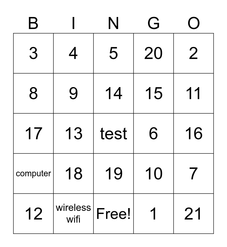 This bingo card has 25 words: computer, wireless wifi, test, 1, 2, 3, 4, 5, 6, 7, 8, 9, Free!, 10, 11, 12, 13, 14, 15, 16, 17, 18, 19, 20 and 21.