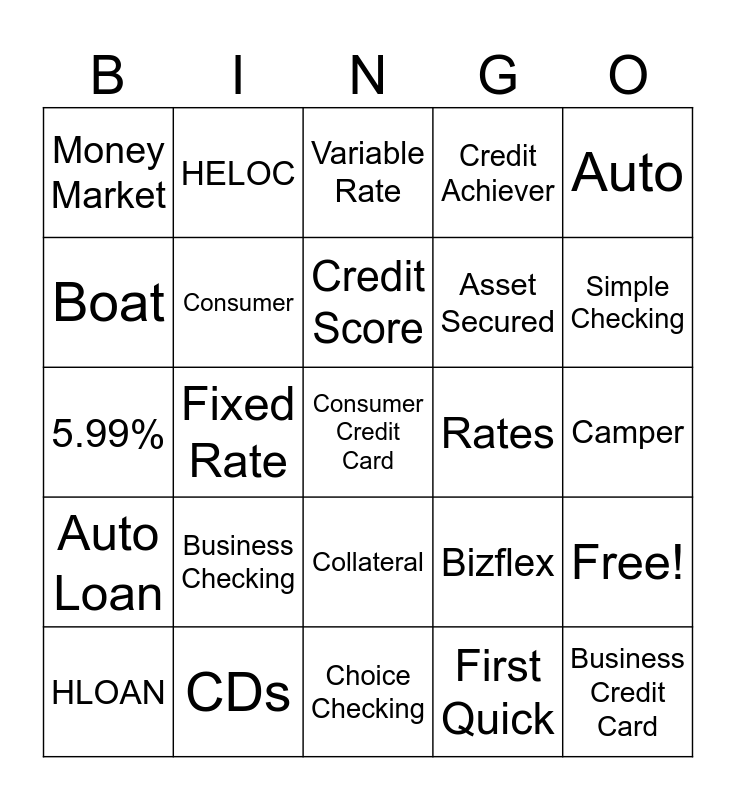 This bingo card has 26 words: Collateral, First Quick, Credit Score, CDs, Auto, Money Market, Boat, HELOC, Camper, Bizflex, Asset Secured, 5.99%, Free!, HLOAN, Fixed Rate, Secured Credit Card, Credit Achiever, Auto Loan, Variable Rate, Consumer Credit Card, Simple Checking, Choice Checking, Rates, Business Checking, Consumer and Business Credit Card.
