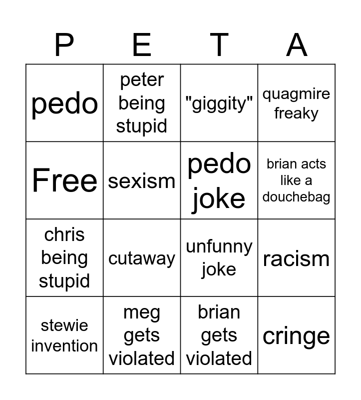 This bingo card has 16 words: meg gets violated, racism, "giggity", pedo, chris being stupid, peter being stupid, unfunny joke, brian gets violated, Free, sexism, stewie invention, quagmire freaky, cutaway, brian acts like a douchebag, pedo joke and cringe.