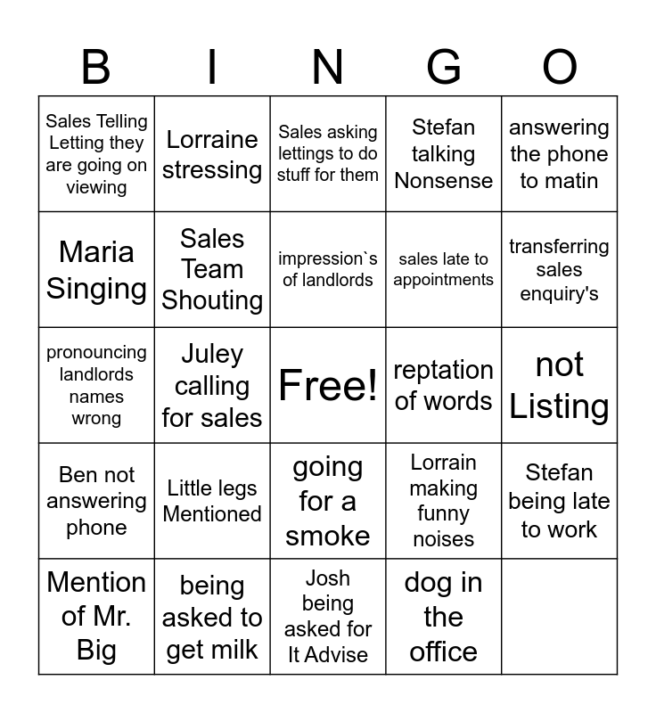 This bingo card has a free space and 24 words: Mention of Mr. Big, Lorrain making funny noises, Sales Team Shouting, Stefan being late to work, Maria Singing, Stefan talking Nonsense, Lorraine stressing, Sales Telling Letting they are going on viewing, Josh being asked for It Advise, not Listing, pronouncing landlords names wrong, Juley calling for sales, going for a smoke, reptation of words, answering the phone to matin, congratulations on completion, Little legs Mentioned, Sales asking lettings to do stuff for them, sales late to appointments, transferring sales enquiry's, Ben not answering phone, being asked to get milk, impression`s of landlords and dog in the office.