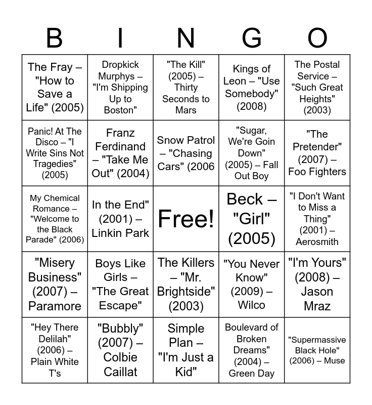 This bingo card has a free space and 35 words: The White Stripes – "Seven Nation Army" (2003), The Strokes – "Last Nite" (2001), Coldplay – "Clocks" (2002), Franz Ferdinand – "Take Me Out" (2004), The Killers – "Mr. Brightside" (2003), Kings of Leon – "Use Somebody" (2008), Panic! At The Disco – "I Write Sins Not Tragedies" (2005), The Killers – "Somebody Told Me" (2004), Snow Patrol – "Chasing Cars" (2006, Death Cab for Cutie – "I Will Follow You into the Dark" (2005), My Chemical Romance – "Welcome to the Black Parade" (2006), The Postal Service – "Such Great Heights" (2003), Bright Eyes – "First Day of My Life" (2005), Vampire Weekend – "Oxford Comma" (2008), The Fray – "How to Save a Life" (2005), Beck – "Girl" (2005), Boulevard of Broken Dreams" (2004) – Green Day, In the End" (2001) – Linkin Park, "Misery Business" (2007) – Paramore, "Supermassive Black Hole" (2006) – Muse, "You Never Know" (2009) – Wilco, "Hey There Delilah" (2006) – Plain White T's, "I'm Yours" (2008) – Jason Mraz, "Bubbly" (2007) – Colbie Caillat, "The Kill" (2005) – Thirty Seconds to Mars, "The Pretender" (2007) – Foo Fighters, "Here Without You" (2003) – 3 Doors Down, "The Middle" (2002) – Jimmy Eat World, "Sugar, We're Goin Down" (2005) – Fall Out Boy, "I Don't Want to Miss a Thing" (2001) – Aerosmith, "Bring Me to Life" (2003) – Evanescence, Simple Plan – "I'm Just a Kid", Boys Like Girls – "The Great Escape", Dropkick Murphys – "I'm Shipping Up to Boston" and New Found Glory – "My Friends Over You".