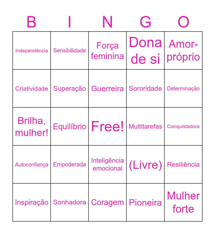 This bingo card has a free space and 25 words: Empoderada, Coragem, Guerreira, Inspiração, Amor-próprio, Independência, Criatividade, Sensibilidade, Multitarefas, Inteligência emocional, Sororidade, Brilha, mulher!, (Livre), Resiliência, Superação, Líder nata, Conquistadora, Força feminina, Determinação, Equilíbrio, Mulher forte, Sonhadora, Autoconfiança, Dona de si and Pioneira.