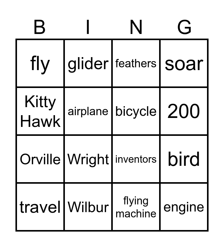 This bingo card has 16 words: Wilbur, bird, feathers, fly, Orville, glider, inventors, flying machine, Kitty Hawk, airplane, travel, soar, Wright, 200, bicycle and engine.