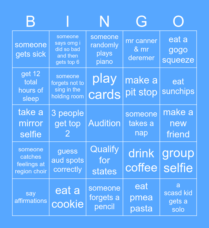 This bingo card has a free space and 26 words: Qualify for states, eat pmea pasta, play cards, eat a cookie, eat a gogo squeeze, someone gets sick, get 12 total hours of sleep, someone says omg i did so bad and then gets top 6, make a new friend, drink coffee, make a pit stop, take a mirror selfie, group selfie, say affirmations, 3 people get top 2, get lectured, mr canner & mr deremer, someone catches feelings at region choir, someone randomly plays piano, a scasd kid gets a solo, eat sunchips, someone forgets a pencil, someone takes a nap, guess aud spots correctly, someone forgets not to sing in the holding room and explore the school.
