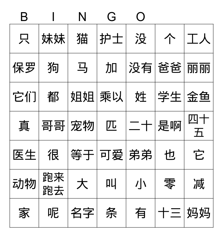 This bingo card has 51 words: 家, 爸爸, 妈妈, 哥哥, 姐姐, 弟弟, 妹妹, 有, 个, 也, 工人, 护士, 学生, 姓, 叫, 医生, 保罗, 丽丽, 呢, 没, 没有, 宠物, 只, 狗, 名字, 匹, 马, 条, 金鱼, 猫, 鸟, 很, 大, 小, 可爱, 真, 是啊, 它, 动物, 跑来跑去, 它们, 都, 零, 十三, 二十, 四十五, 加, 等于, 减, 乘以 and 除以.