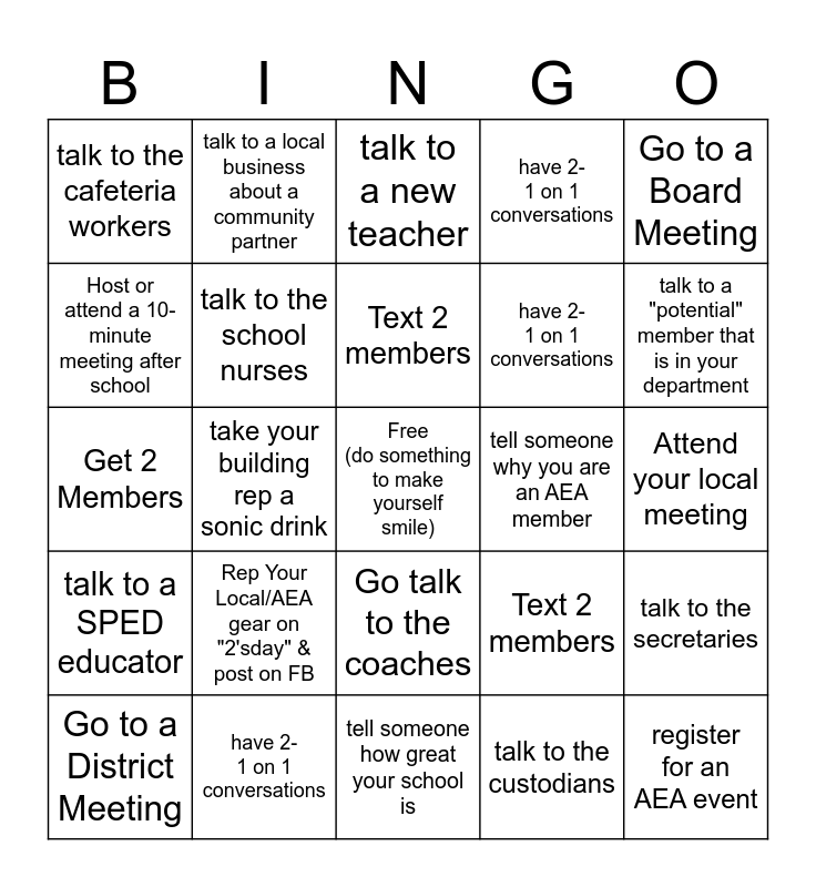 This bingo card has a free space and 24 words: Rep Your Local/AEA gear on "2'sday" & post on FB, have 2- 1 on 1 conversations, Text 2 members, Go to a District Meeting, Go to a Board Meeting, talk to the cafeteria workers, Host or attend a 10-minute meeting after school, talk to a local business about a community partner, tell someone why you are an AEA member, Go talk to the coaches, have 2- 1 on 1 conversations, Get 2 Members, Text 2 members, talk to the secretaries, talk to the school nurses, talk to the custodians, Attend your local meeting, talk to a new teacher, talk to a "potential" member that is in your department, take your building rep a sonic drink, register for an AEA event, talk to a SPED educator, have 2- 1 on 1 conversations and tell someone how great your school is.