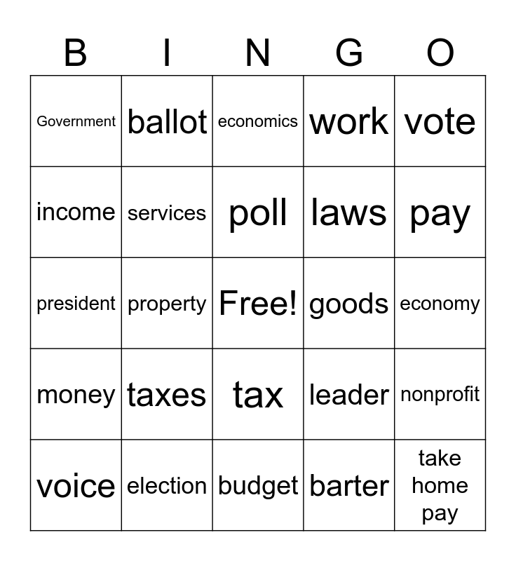 This bingo card has a free space and 24 words: taxes, election, poll, voice, vote, Government, income, ballot, goods, tax, laws, president, leader, nonprofit, services, barter, economy, economics, pay, property, take home pay, money, work and budget.