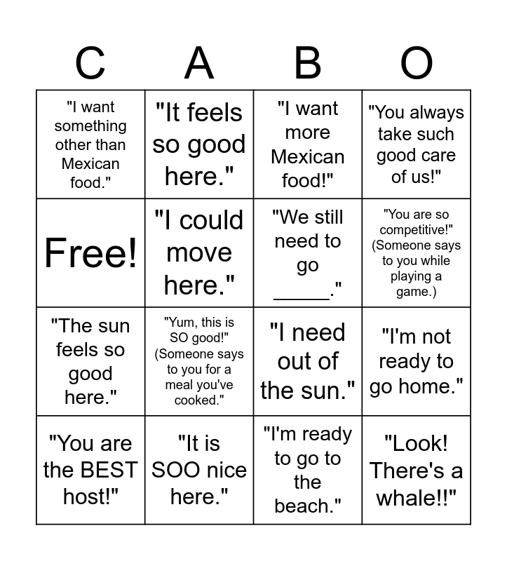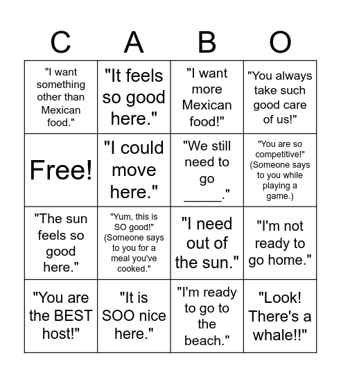 This bingo card has 16 words: "It is SOO nice here.", "I'm not ready to go home.", "I want more Mexican food!", "I want something other than Mexican food.", "The sun feels so good here.", "It feels so good here.", "I need out of the sun.", "I'm ready to go to the beach.", Free!, "I could move here.", "You are the BEST host!", "You always take such good care of us!", "Yum, this is SO good!" (Someone says to you for a meal you've cooked.", "You are so competitive!" (Someone says to you while playing a game.), "We still need to go _____." and "Look! There's a whale!!".
