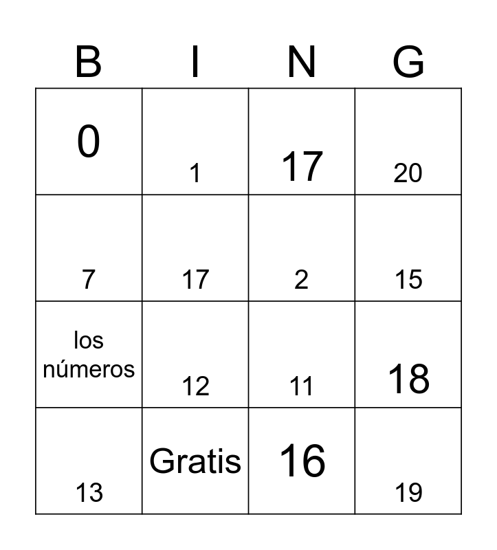 This bingo card has 24 words: 10, 8, 15, 9, 7, 0, 17, 1, Gratis, 6, los números, 11, 3, 14, 2, 5, 16, 17, 12, 18, 13, 19, 20 and 4.