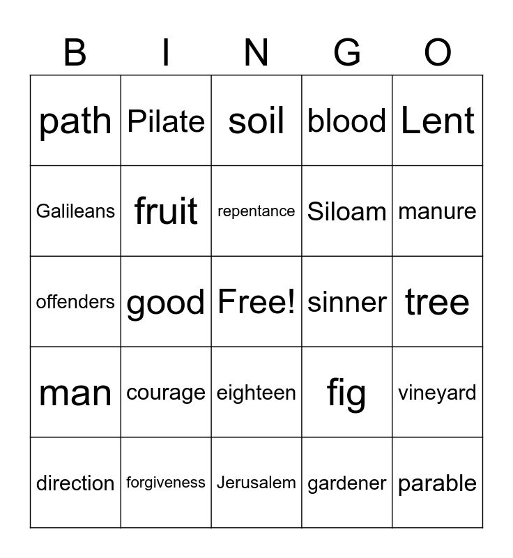 This bingo card has a free space and 24 words: courage, forgiveness, repentance, direction, Lent, path, Galileans, Pilate, sinner, eighteen, Siloam, offenders, fig, vineyard, fruit, gardener, tree, soil, manure, good, parable, man, blood and Jerusalem.