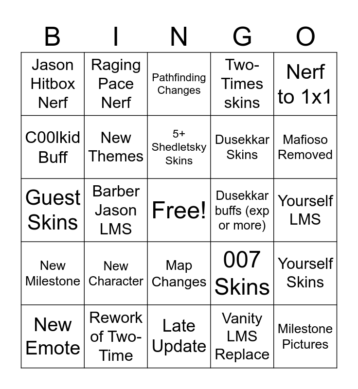 This bingo card has a free space and 24 words: New Character, Rework of Two-Time, 5+ Shedletsky Skins, New Emote, Nerf to 1x1, Jason Hitbox Nerf, C00lkid Buff, Raging Pace Nerf, Dusekkar buffs (exp or more), Map Changes, Dusekkar Skins, Guest Skins, 007 Skins, Yourself Skins, New Themes, Vanity LMS Replace, Yourself LMS, Pathfinding Changes, Mafioso Removed, Barber Jason LMS, Milestone Pictures, New Milestone, Two-Times skins and Late Update.