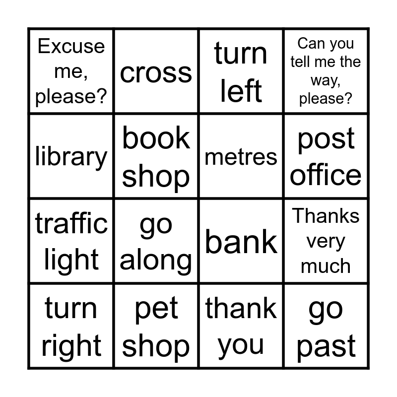 This bingo card has 16 words: pet shop, Thanks very much, turn left, Excuse me, please?, traffic light, cross, bank, thank you, library, book shop, turn right, Can you tell me the way, please?, go along, post office, metres and go past.