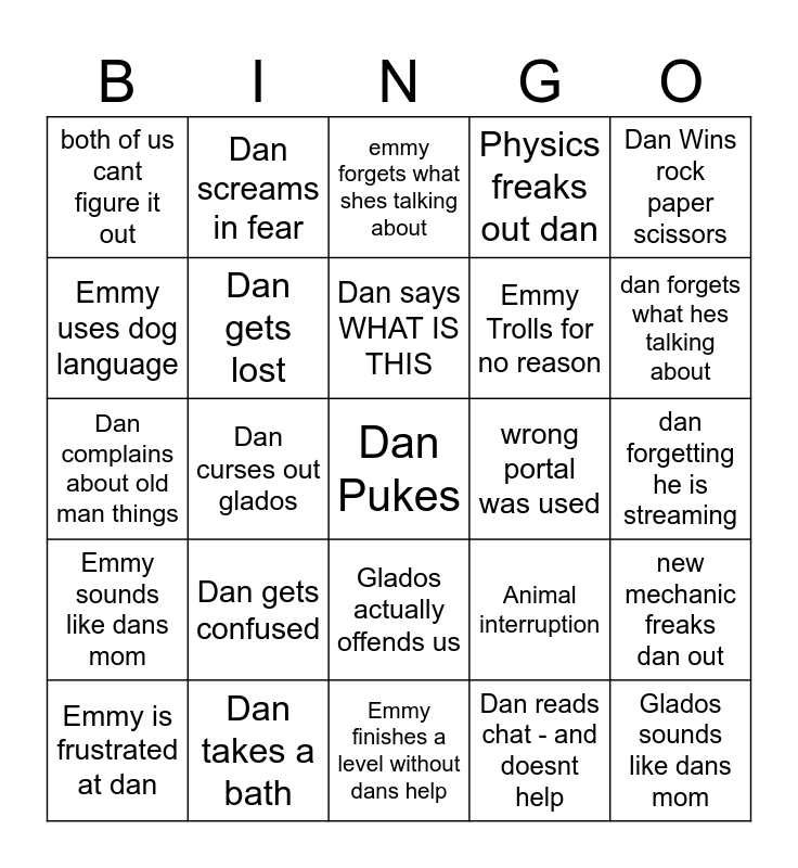 This bingo card has a free space and 24 words: Dan gets confused, Dan takes a bath, Dan says WHAT IS THIS, Emmy is frustrated at dan, Dan Wins rock paper scissors, both of us cant figure it out, Emmy uses dog language, Dan screams in fear, wrong portal was used, Glados actually offends us, Emmy Trolls for no reason, Dan complains about old man things, Animal interruption, new mechanic freaks dan out, Dan gets lost, Dan reads chat - and doesnt help, dan forgetting he is streaming, emmy forgets what shes talking about, dan forgets what hes talking about, Dan curses out glados, Glados sounds like dans mom, Emmy sounds like dans mom, Physics freaks out dan and Emmy finishes a level without dans help.