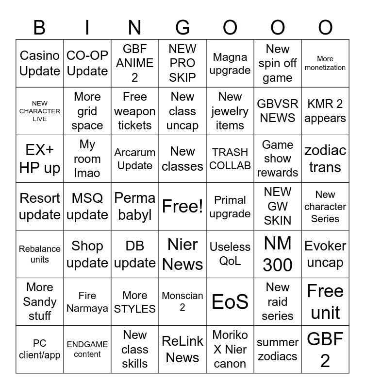 This bingo card has a free space and 48 words: EoS, GBVSR NEWS, ReLink News, MSQ update, Arcarum Update, New character Series, CO-OP Update, ENDGAME content, New spin off game, Nier News, More monetization, NEW PRO SKIP, Game show rewards, TRASH COLLAB, More Sandy stuff, NEW GW SKIN, NEW CHARACTER LIVE, KMR 2 appears, New raid series, Magna upgrade, New jewelry items, Perma babyl, Casino Update, More grid space, Free unit, Free weapon tickets, zodiac trans, PC client/app, New classes, My room lmao, summer zodiacs, Primal upgrade, Evoker uncap, Fire Narmaya, Resort update, Useless QoL, NM 300, EX+ HP up, DB update, More STYLES, Rebalance units, GBF 2, GBF ANIME 2, New class skills, New class uncap, Monscian 2, Shop update and Moriko X Nier canon.