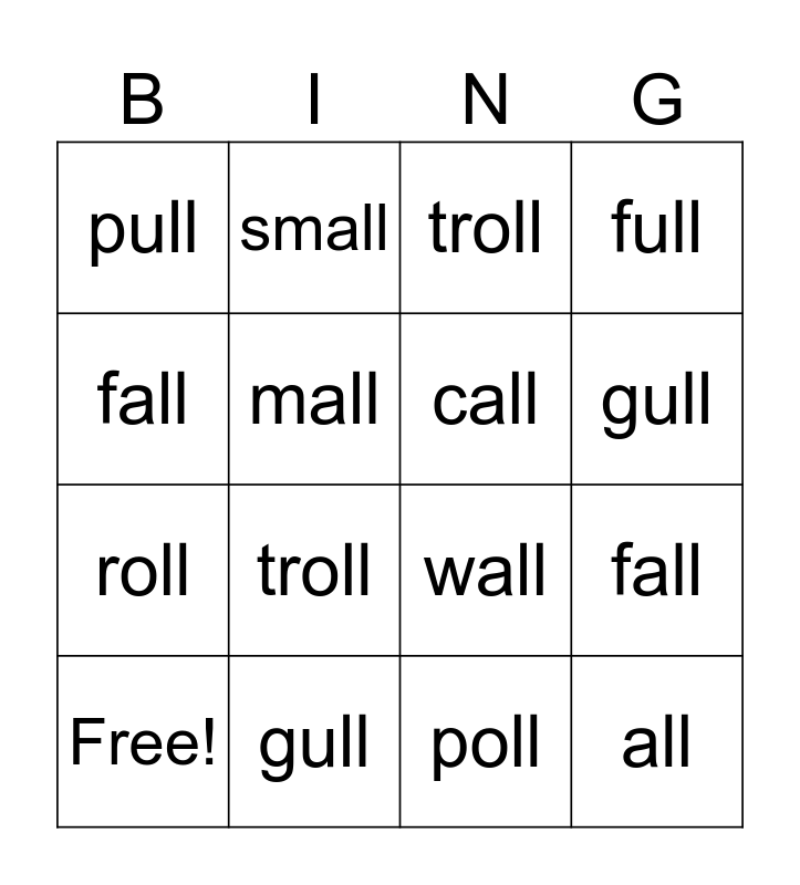 This bingo card has 23 words: all, bull, gull, full, fall, pull, mall, small, Free!, ball, troll, roll, tall, toll, gull, hall, troll, wall, call, fall, full, poll and stall.