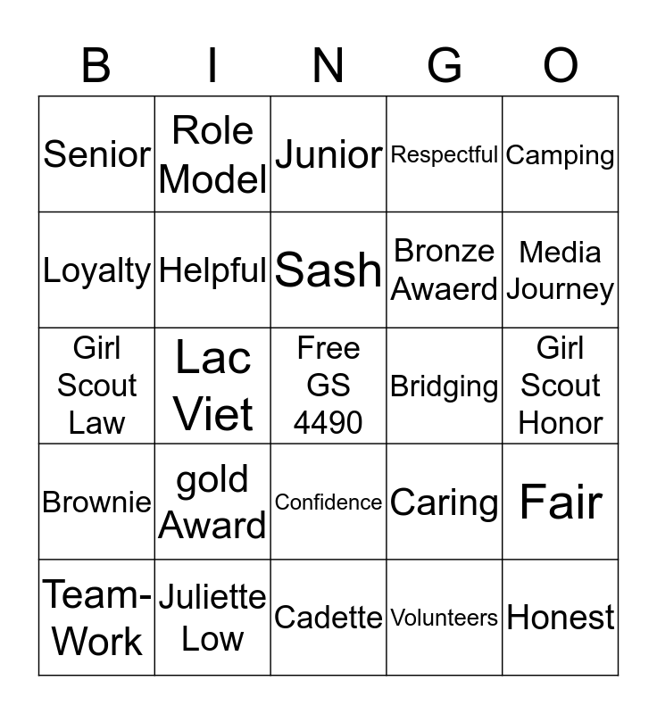 This bingo card has a free space and 24 words: gold Award, Juliette Low, Sash, Team- Work, Camping, Senior, Loyalty, Role Model, Bridging, Confidence, Bronze Awaerd, Girl Scout Law, Caring, Fair, Helpful, Volunteers, Girl Scout Honor, Junior, Media Journey, Lac Viet, Honest, Brownie, Respectful and Cadette.