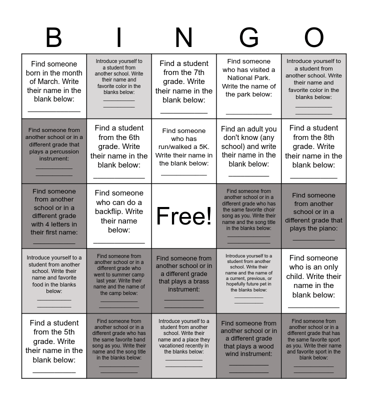 This bingo card has a free space and 24 words: Find a student from the 5th grade. Write their name in the blank below: __________, Find someone from another school or in a different grade who went to summer camp last year. Write their name and the name of the camp below: _____________ ______________, Find someone who has run/walked a 5K. Write their name in the blank below: ____________, Find someone from another school or in a different grade that plays a wood wind instrument: ___________ ___________, Introduce yourself to a student from another school. Write their name and favorite color in the blanks below: ___________ ___________, Find someone born in the month of March. Write their name in the blank below: _____________, Introduce yourself to a student from another school. Write their name and favorite color in the blanks below: ___________ ___________, Find a student from the 7th grade. Write their name in the blank below: ___________, Find someone from another school or in a different grade who has the same favorite choir song as you. Write their name and the song title in the blanks below: _______________ _______________, Find someone from another school or in a different grade that plays the piano: ___________, Find someone from another school or in a different grade with 4 letters in their first name: ___________, Find a student from the 6th grade. Write their name in the blank below: ____________, Introduce yourself to a student from another school. Write their name and the name of a current, previous, or hopefully future pet in the blanks below: ___________ ___________, Find someone who is an only child. Write their name in the blank below: ____________, Find someone from another school or in a different grade that plays a percussion instrument: ___________ ___________, Find someone from another school or in a different grade who has the same favorite band song as you. Write their name and the song title in the blanks below: ______________ _____________, Introduce yourself to a student from another school. Write their name and a place they vacationed recently in the blanks below: _____________ _____________, Find someone who has visited a National Park. Write the name of the park below: ____________, Find a student from the 8th grade. Write their name in the blank below: ___________, Introduce yourself to a student from another school. Write their name and favorite food in the blanks below: ___________ ___________, Find someone who can do a backflip. Write their name below: ____________, Find someone from another school or in a different grade that plays a brass instrument: ___________ ___________, Find an adult you don't know (any school) and write their name in the blank below: __________ and Find someone from another school or in a different grade that has the same favorite sport as you. Write their name and favorite sport in the blank below: ______________ ______________.