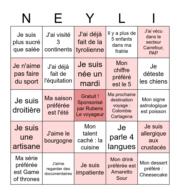 This bingo card has a free space and 24 words: J'aime le bourgogne, J'aime regarder des documentaires, Je suis née un mardi, Ma série préférée est Game of thrones, J'ai vécu dans le secteur Carrefour, PAP, Je suis plus sucré que salée, Je n'aime pas faire du sport, J'ai visité 3 continents, Ma prochaine destination voyage : Colombie Cartagena, Mon talent caché : la cuisine, Mon chiffre préféré est le 5, Je suis droitière, Je parle 4 langues, Je suis allergique aux crustacés, J'ai déjà fait de l'équitation, Mon drink préférée est Amaretto Sour, Mon signe astrologique est poisson, J'ai déjà fait de la tyrolienne, Je déteste les chiens, Ma saison préférée est l'été, Mon dessert préféré : Cheesecake, Je suis une artisane, Il y a plus de 5 enfants dans ma fratrie and Je suis impatiente.
