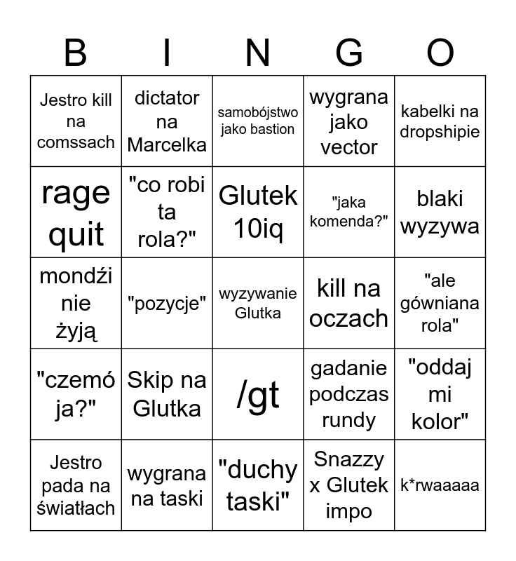 This bingo card has a free space and 24 words: Jestro pada na światłach, Skip na Glutka, Glutek 10iq, Snazzy x Glutek impo, kabelki na dropshipie, Jestro kill na comssach, dictator na Marcelka, samobójstwo jako bastion, kill na oczach, "ale gówniana rola", mondźi nie żyją, "co robi ta rola?", gadanie podczas rundy, "oddaj mi kolor", rage quit, wygrana na taski, "duchy taski", wygrana jako vector, blaki wyzywa, "czemó ja?", "pozycje", /gt, "jaka komenda?" and k*rwaaaaa.