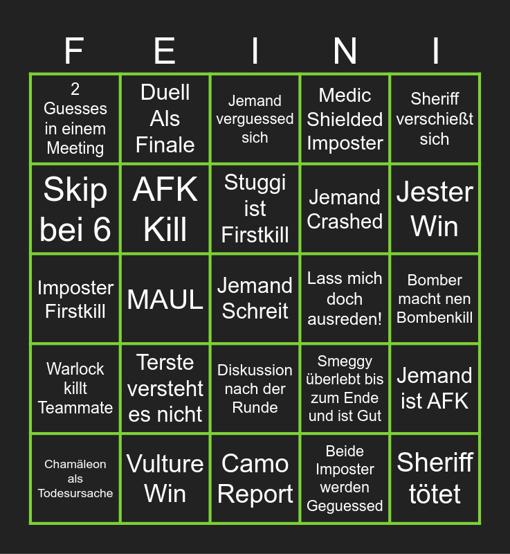 This bingo card has a free space and 24 words: Terste versteht es nicht, Vulture Win, Stuggi ist Firstkill, Chamäleon als Todesursache, Sheriff verschießt sich, 2 Guesses in einem Meeting, Skip bei 6, Duell Als Finale, Lass mich doch ausreden!, Diskussion nach der Runde, Jemand Crashed, Imposter Firstkill, Smeggy überlebt bis zum Ende und ist Gut, Jemand ist AFK, AFK Kill, Beide Imposter werden Geguessed, Bomber macht nen Bombenkill, Jemand verguessed sich, Jester Win, MAUL, Sheriff tötet, Warlock killt Teammate, Medic Shielded Imposter and Camo Report.