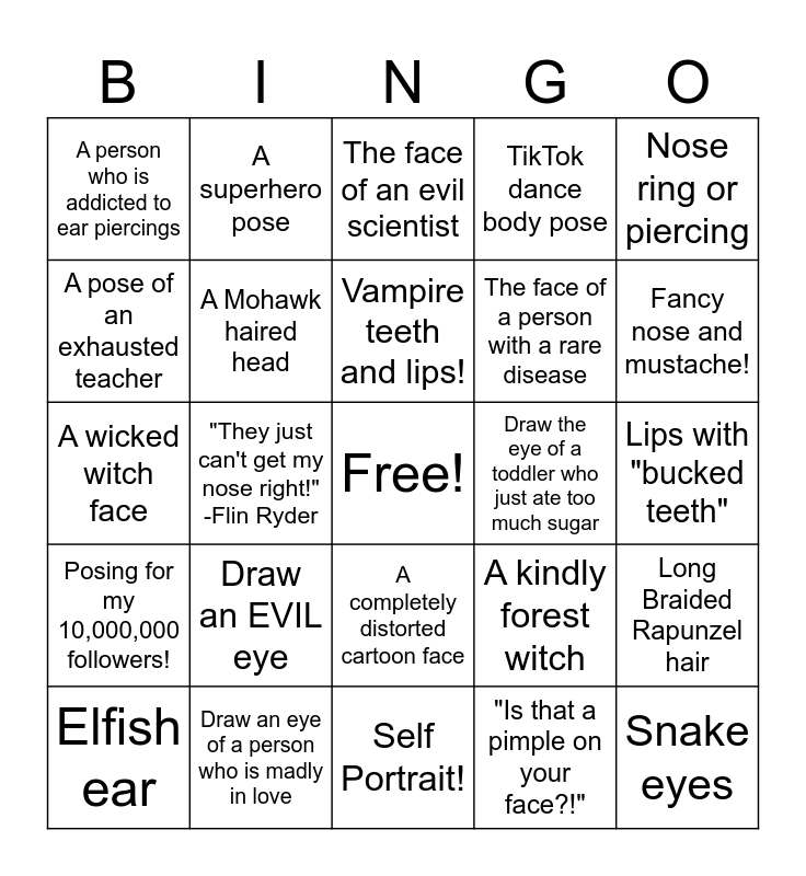 This bingo card has a free space and 24 words: Draw an EVIL eye, Draw an eye of a person who is madly in love, Vampire teeth and lips!, Elfish ear, Nose ring or piercing, A person who is addicted to ear piercings, A pose of an exhausted teacher, A superhero pose, Draw the eye of a toddler who just ate too much sugar, A completely distorted cartoon face, The face of a person with a rare disease, A wicked witch face, A kindly forest witch, Long Braided Rapunzel hair, A Mohawk haired head, "Is that a pimple on your face?!", Lips with "bucked teeth", The face of an evil scientist, Fancy nose and mustache!, "They just can't get my nose right!" -Flin Ryder, Snake eyes, Posing for my 10,000,000 followers!, TikTok dance body pose and Self Portrait!.