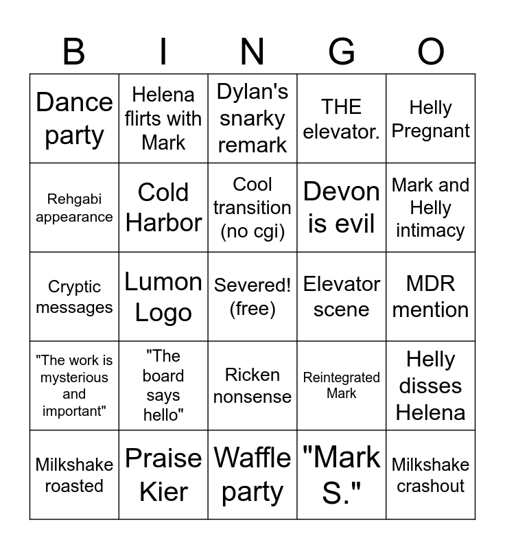 This bingo card has a free space and 34 words: Gemma's lethal face card, "Mark S.", Irving and Burt run away, Irving painting mentioned, "The work is mysterious and important", Cold Harbor, Helly Pregnant, Milkshake roasted, Helena flirts with Mark, Miss Huang and Milkshake beef, Cool transition (no cgi), Dylan's snarky remark, Flashback sequence, Cobel Appearance, Elevator scene, Mark and Helly intimacy, Praise Kier, Cryptic messages, "The board says hello", Reintegrated Mark, Ricken nonsense, Helly/Mark/Gemma Love triangle???, Dance party, MDR mention, Waffle party, Milkshake crashout, THE elevator., Cobel appearance, Devon is evil, Rehgabi appearance, Irving baby appearance, Lumon Logo, Helly disses Helena and Break room.