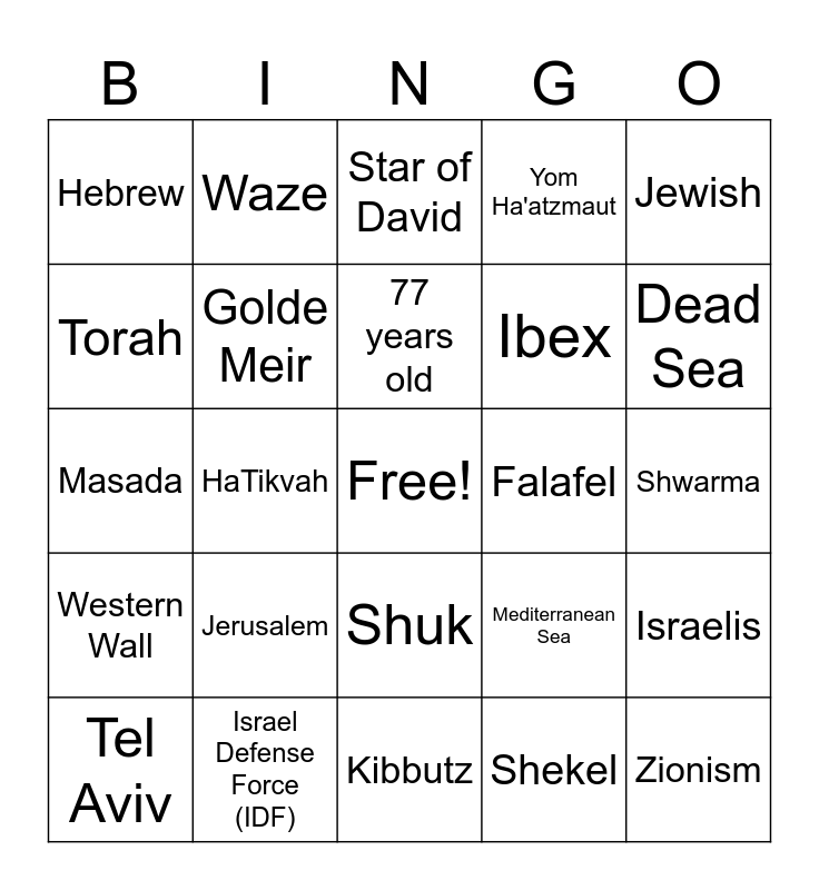 This bingo card has a free space and 29 words: Tel Aviv, David Ben-Gurion, HaTikvah, Hummus, Hebrew, Star of David, Golde Meir, Jerusalem, Falafel, Israel Defense Force (IDF), Shwarma, Zionism, Kibbutz, Shekel, Dead Sea, Camels, Shuk, Western Wall, Jewish, Masada, Mediterranean Sea, Shabbat, Ibex, Torah, Yom Ha'atzmaut, Waze, Israelis, 77 years old and Haifa.