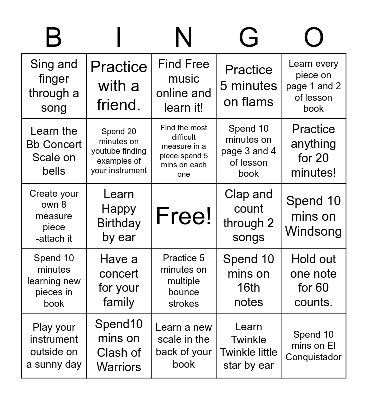 This bingo card has a free space and 24 words: Have a concert for your family, Spend10 mins on Clash of Warriors, Find the most difficult measure in a piece-spend 5 mins on each one, Play your instrument outside on a sunny day, Learn every piece on page 1 and 2 of lesson book, Sing and finger through a song, Learn the Bb Concert Scale on bells, Practice with a friend., Clap and count through 2 songs, Practice 5 minutes on multiple bounce strokes, Spend 10 minutes on page 3 and 4 of lesson book, Create your own 8 measure piece -attach it, Spend 10 mins on 16th notes, Hold out one note for 60 counts., Spend 20 minutes on youtube finding examples of your instrument, Learn Twinkle Twinkle little star by ear, Spend 10 mins on Windsong, Find Free music online and learn it!, Practice anything for 20 minutes!, Learn Happy Birthday by ear, Spend 10 mins on El Conquistador, Spend 10 minutes learning new pieces in book, Practice 5 minutes on flams and Learn a new scale in the back of your book.