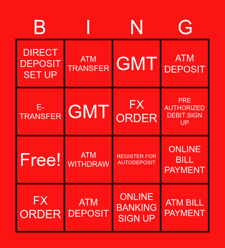 This bingo card has 20 words: FX ORDER, E-TRANSFER, GMT, ONLINE BILL PAYMENT, E-DEPOSIT, ATM WITHDRAW, ONLINE BANKING SIGN UP, ATM DEPOSIT, Free!, ATM TRANSFER, REGISTER FOR AUTODEPOSIT, PRE AUTHORIZED DEBIT SIGN UP, DIRECT DEPOSIT SET UP, ATM DEPOSIT, FX ORDER, ATM WITHDRAW, E-TRANSFER, GMT, ATM VISA PAYMENT and ATM BILL PAYMENT.