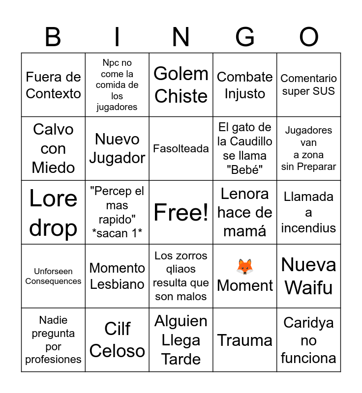 This bingo card has a free space and 24 words: Momento Lesbiano, Cilf Celoso, Fasolteada, Nadie pregunta por profesiones, Comentario super SUS, Fuera de Contexto, Calvo con Miedo, Npc no come la comida de los jugadores, Lenora hace de mamá, Los zorros qliaos resulta que son malos, El gato de la Caudillo se llama "Bebé", Lore drop, 🦊Moment, Nueva Waifu, Nuevo Jugador, Trauma, Llamada a incendius, Golem Chiste, Jugadores van a zona sin Preparar, "Percep el mas rapido" *sacan 1*, Caridya no funciona, Unforseen Consequences, Combate Injusto and Alguien Llega Tarde.