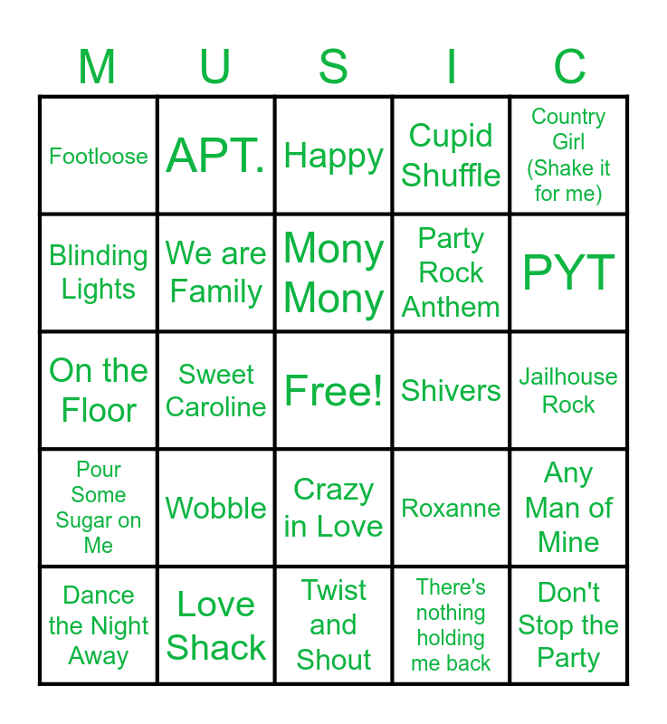 This bingo card has a free space and 29 words: Dance the Night Away, Tipsy, Sweet Caroline, Despacito, Footloose, Happy, We are Family, Wobble, Shivers, Love Shack, Jailhouse Rock, Don't Stop the Party, Twist and Shout, There's nothing holding me back, PYT, Wonderful Tonight, Crazy in Love, Pour Some Sugar on Me, Country Girl (Shake it for me), On the Floor, Roxanne, Tennessee Whiskey, Party Rock Anthem, Blinding Lights, Cupid Shuffle, APT., Any Man of Mine, Mony Mony and Waterfalls.