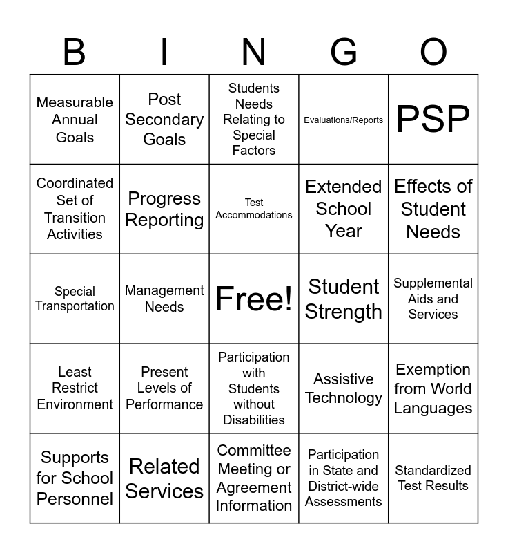 This bingo card has a free space and 24 words: Present Levels of Performance, Related Services, Test Accommodations, Supports for School Personnel, PSP, Measurable Annual Goals, Coordinated Set of Transition Activities, Post Secondary Goals, Student Strength, Participation with Students without Disabilities, Extended School Year, Special Transportation, Assistive Technology, Exemption from World Languages, Progress Reporting, Participation in State and District-wide Assessments, Supplemental Aids and Services, Students Needs Relating to Special Factors, Effects of Student Needs, Management Needs, Standardized Test Results, Least Restrict Environment, Evaluations/Reports and Committee Meeting or Agreement Information.
