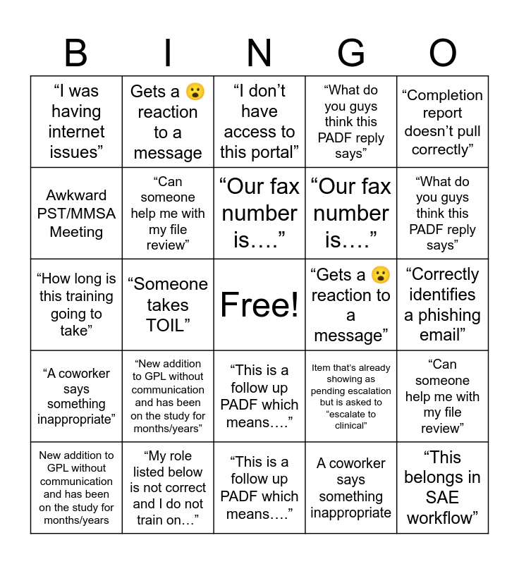 This bingo card has a free space and 41 words: “I was having internet issues”, “How long is this training going to take”, “I don’t have access to this portal”, “Can someone help me with my file review”, “My role listed below is not correct and I do not train on…”, “This is a follow up PADF which means….”, “Our fax number is….”, “I am no longer active on this study…”, “Completion report doesn’t pull correctly”, “A coworker says something inappropriate”, “Someone takes TOIL”, “What do you guys think this PADF reply says”, “This belongs in SAE workflow”, “Correctly identifies a phishing email”, “Gets a 😮 reaction to a message”, “New addition to GPL without communication and has been on the study for months/years”, “, “I was having internet issues”, “How long is this training going to take”, “I don’t have access to this portal”, “Can someone help me with my file review”, “My role listed below is not correct and I do not train on…”, “This is a follow up PADF which means….”, “Our fax number is….”, “I am no longer active on this study…”, Completion report doesn’t pull correctly, A coworker says something inappropriate, Someone takes TOIL, “What do you guys think this PADF reply says”, “This belongs in SAE workflow”, Correctly identifies a phishing email, Gets a 😮 reaction to a message, New addition to GPL without communication and has been on the study for months/years, “You have past due items in MM review”, Item that’s already showing as pending escalation but is asked to “escalate to clinical”, Awkward PST/MMSA Meeting, “I’m so busy (they are lying)”, “Please file these docs” (docs are several months/years old), “Why were these docs over 30 days?….well, Linda, you see these document were shared with me until….”, Someone calls you a nickname when you aren’t friends/have ever spoken to them and “This was never sent/told to me”.