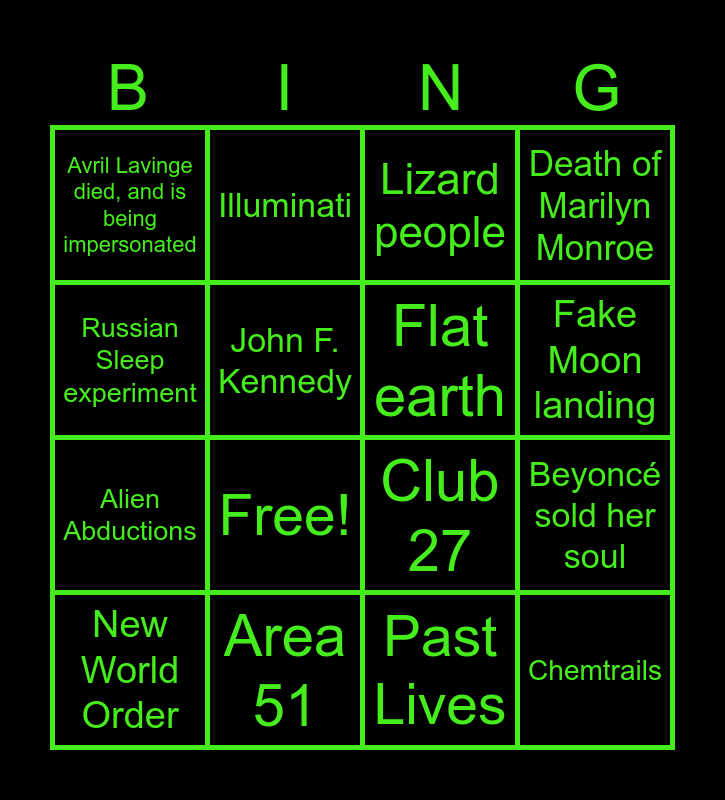This bingo card has 18 words: Free!, Chemtrails, Lizard people, Avril Lavinge died, and is being impersonated, Club 27, Death of Marilyn Monroe, New World Order, Illuminati, Fake Moon landing, Alien Abductions, Past Lives, Russian Sleep experiment, Beyoncé sold her soul, John F. Kennedy, Flat earth, Covid-19 vaccine, Area 51 and New Coke.