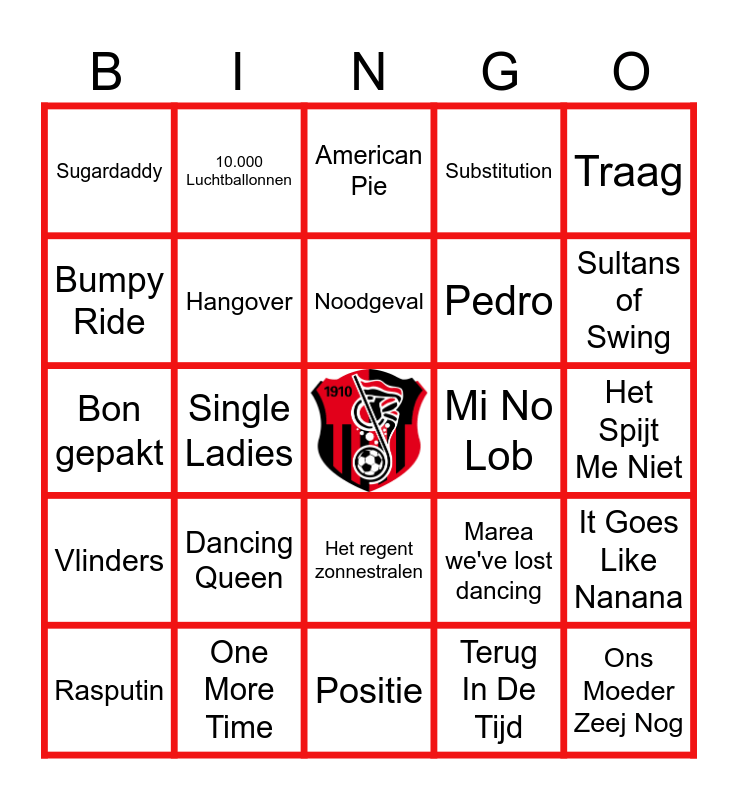 This bingo card has a free space and 51 words: Zoet, Zout, Zuur, Ons Moeder Zeej Nog, Ferry de roze flamingo, Positie, Dancing Queen, Jij krijgt die lach niet van mijn gezicht, 10.000 Luchtballonnen, Viben, Bumpy Ride, Murder On The Dancefloor, Hangover, Substitution, It Goes Like Nanana, Marea we've lost dancing, Dansplaat, Charlemagne, Noodgeval, Mi No Lob, September, Traag, Single Ladies, Terug In De Tijd, Sugardaddy, Pedro, Europapa, Engelbewaarder, Sultans of Swing, Mi Gente, Rasputin, American Pie, Gimme! Gimme! Gimme!, Stupid, Malle Babbe, Breaking Free, Africa, One More Time, Kronenburg Park, Nijmegen, Hypnotized, 501, Het Spijt Me Niet, Vlinders, Sterrenstof, Versaces In Het Zand, Ding Ding Ding, Ik ga zwemmen, Bon gepakt, Sexy als ik dans, Kali, Het regent zonnestralen and Rampeneren.