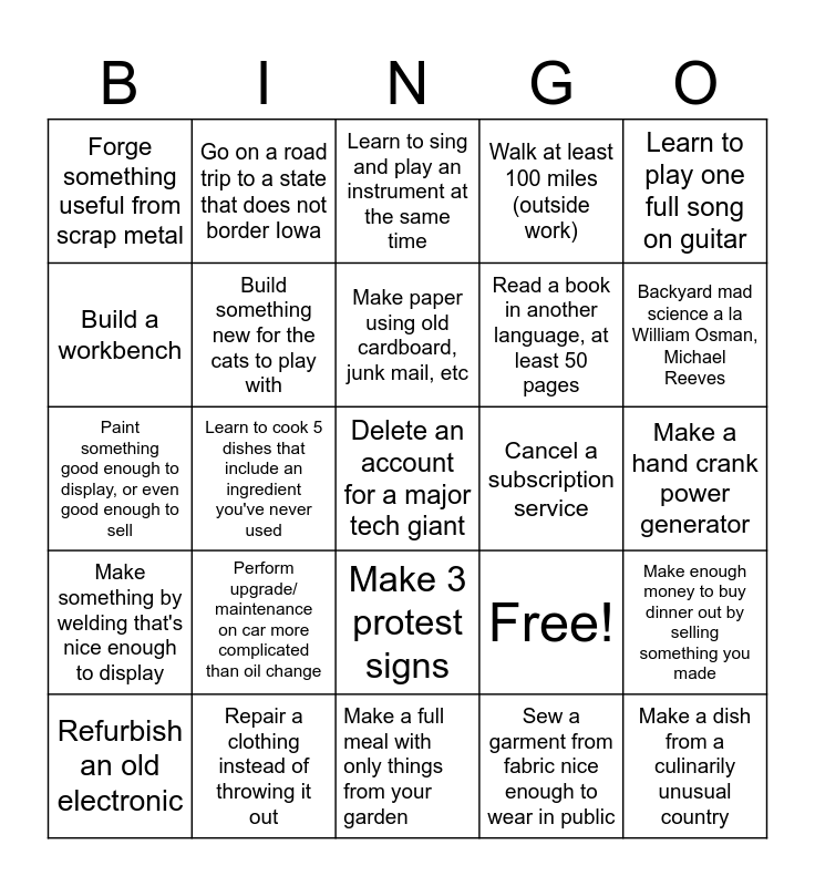This bingo card has 25 words: Perform upgrade/ maintenance on car more complicated than oil change, Make a full meal with only things from your garden, Make paper using old cardboard, junk mail, etc, Refurbish an old electronic, Learn to play one full song on guitar, Forge something useful from scrap metal, Build a workbench, Go on a road trip to a state that does not border Iowa, Cancel a subscription service, Make 3 protest signs, Read a book in another language, at least 50 pages, Paint something good enough to display, or even good enough to sell, Free!, Make enough money to buy dinner out by selling something you made, Build something new for the cats to play with, Make a dish from a culinarily unusual country, Make a hand crank power generator, Learn to sing and play an instrument at the same time, Backyard mad science a la William Osman, Michael Reeves, Learn to cook 5 dishes that include an ingredient you've never used, Delete an account for a major tech giant, Repair a clothing instead of throwing it out, Make something by welding that's nice enough to display, Walk at least 100 miles (outside work) and Sew a garment from fabric nice enough to wear in public.