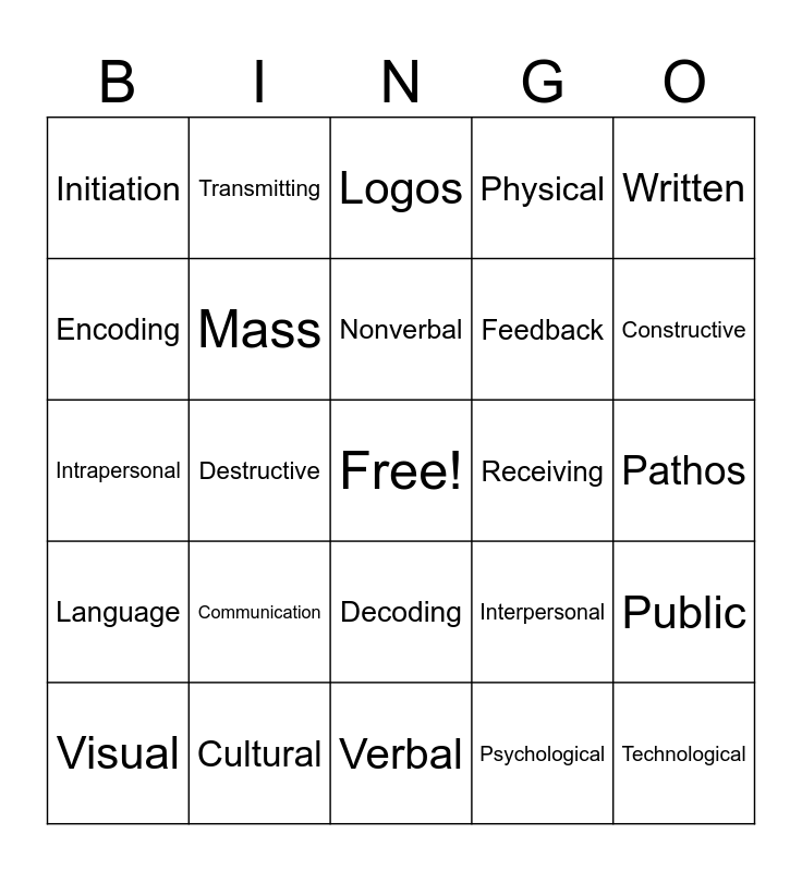 This bingo card has a free space and 25 words: Communication, Verbal, Nonverbal, Visual, Written, Initiation, Encoding, Transmitting, Receiving, Decoding, Feedback, Intrapersonal, Interpersonal, Public, Mass, Ethos, Pathos, Logos, Constructive, Destructive, Technological, Cultural, Language, Physical and Psychological.
