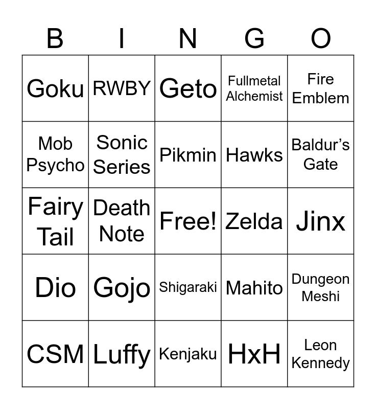This bingo card has a free space and 24 words: Gojo, Luffy, Pikmin, CSM, Fire Emblem, Goku, Mob Psycho, RWBY, Zelda, Shigaraki, Hawks, Fairy Tail, Mahito, Dungeon Meshi, Sonic Series, HxH, Jinx, Geto, Baldur’s Gate, Death Note, Leon Kennedy, Dio, Fullmetal Alchemist and Kenjaku.