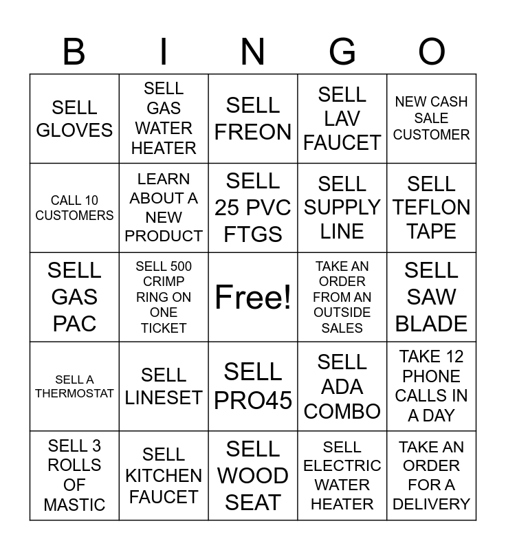 This bingo card has a free space and 24 words: SELL LINESET, SELL KITCHEN FAUCET, SELL 25 PVC FTGS, SELL 3 ROLLS OF MASTIC, NEW CASH SALE CUSTOMER, SELL GLOVES, CALL 10 CUSTOMERS, SELL GAS WATER HEATER, TAKE AN ORDER FROM AN OUTSIDE SALES, SELL PRO45, SELL SUPPLY LINE, SELL GAS PAC, SELL ADA COMBO, TAKE 12 PHONE CALLS IN A DAY, LEARN ABOUT A NEW PRODUCT, SELL ELECTRIC WATER HEATER, SELL SAW BLADE, SELL FREON, SELL TEFLON TAPE, SELL 500 CRIMP RING ON ONE TICKET, TAKE AN ORDER FOR A DELIVERY, SELL A THERMOSTAT, SELL LAV FAUCET and SELL WOOD SEAT.