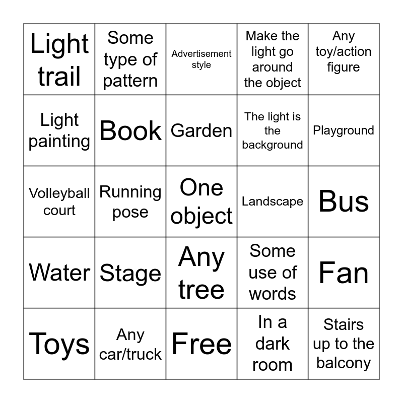 This bingo card has 25 words: Water, Any car/truck, One object, In a dark room, Any toy/action figure, Light trail, Some type of pattern, Advertisement style, Landscape, Fan, Light painting, Book, Free, Some use of words, Playground, Toys, Running pose, Garden, The light is the background, Bus, Volleyball court, Stage, Any tree, Make the light go around the object and Stairs up to the balcony.