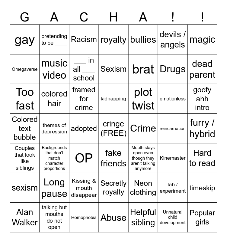 This bingo card has a free space and 48 words: Neon clothing, Drugs, Abuse, themes of depression, framed for crime, furry / hybrid, pretending to be ____, talking but mouths do not open, devils / angels, fake friends, magic, royalty, emotionless, plot twist, sexism, reincarnation, Omegaverse, dead parent, lab / experiment, bullies, brat, adopted, gay, music video, timeskip, ___ in all ___ school, goofy ahh intro, Alan Walker, kidnapping, colored hair, Unnatural child development, Crime, Hard to read, Long pause, Colored text bubble, Mouth stays open even though they aren’t talking anymore, Kinemaster, Too fast, OP, Kissing & mouth disappear, Couples that look like siblings, Popular girls, Racism, Homophobia, Sexism, Secretly royalty, Backgrounds that don’t match character proportions and Helpful sibling.