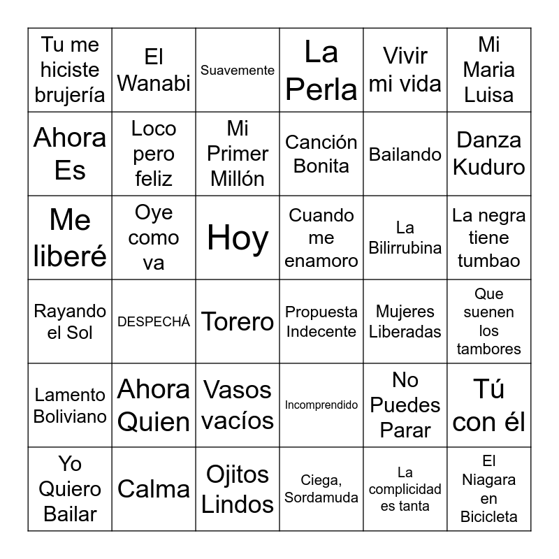 This bingo card has 75 words: BAILE INoLVIDABLE, El Niagara en Bicicleta, Suavemente, Asereje, La Vida es un Carnaval, Gasolina, Ciega, Sordamuda, Despacito, Ojitos Lindos, High, Lamento Boliviano, Amanecer Borincano, Loco pero feliz, Mi Maria Luisa, Fruta Fresca, Danza Kuduro, Incomprendido, Me liberé, Livin' La Vida Loca, Vivir mi vida, Calma, Bailando, Ahora Es, El Wanabi, La Perla, La Flaca, La Camisa Negra, No, Latinoamérica, Labios Compartidos, Yo Quiero Bailar, Conteo regresivo, Aguanilé, Rayando el Sol, Canción Bonita, Mi Primer Millón, La Gozadera, Atrévete-Te-Te, Hoy, Que suenen los tambores, El Sol no regresa, Amores como el nuestro, El Gran Varón, Geografía, Víveme, Ahora Quien, Torero, Tu me hiciste brujería, Preciosa, Macarena, Vasos vacíos, La negra tiene tumbao, Pégate, La complicidad es tanta, Tanto Blues, Eres, No Puedes Parar, Como la Flor, Me Gustas Tú, Después de la Playa, La Bilirrubina, Mi Gente, No vuelvas, Dile al amor, Decisiones, Oye como va, Tú con él, Corazón partío, La Tortura, DESPECHÁ, Cuando me enamoro, Propuesta Indecente, Amor de una noche, Mujeres Liberadas and Es mentiroso (2022 version).