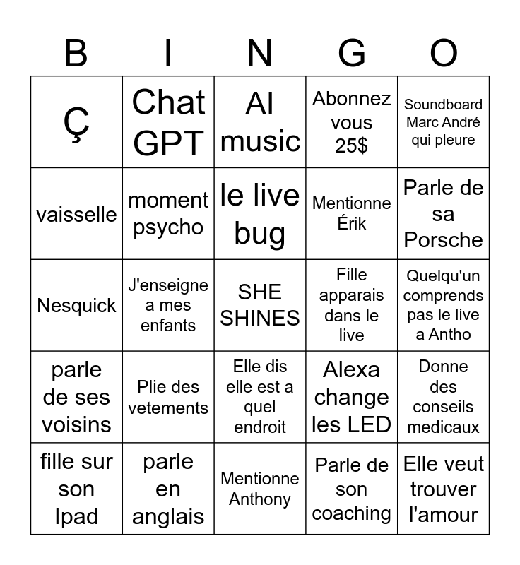 This bingo card has a free space and 28 words: Donne des conseils medicaux, Cancer=Pas grave, Mentionne Érik, Parle de son coaching, vaisselle, AI music, Chat GPT, parle de ses voisins, Fille apparais dans le live, fille sur son Ipad, Nesquick, Abonnez vous 25$, parle en anglais, Mentionne Anthony, Parle de sa Porsche, Quete de l'argent, Plie des vetements, moment psycho, le live bug, Elle dis elle est a quel endroit, Ç, Parle de bouffe, Elle veut trouver l'amour, J'enseigne a mes enfants, Quelqu'un comprends pas le live a Antho, Alexa change les LED, Soundboard Marc André qui pleure and Grace a Dieu.