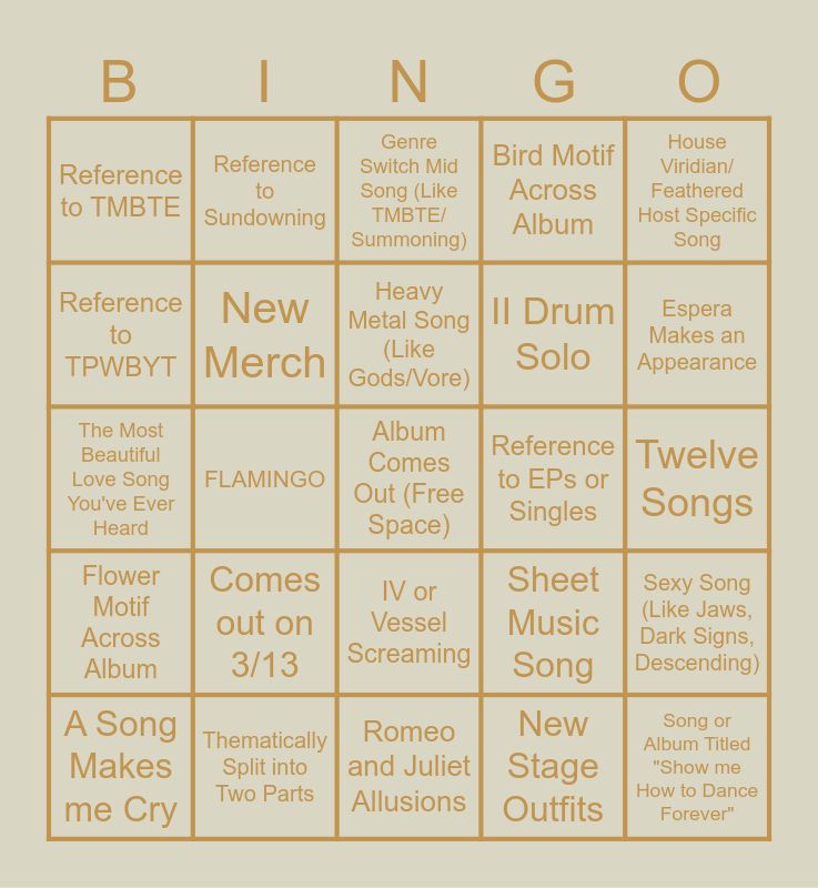 This bingo card has a free space and 24 words: Comes out on 3/13, Thematically Split into Two Parts, Heavy Metal Song (Like Gods/Vore), A Song Makes me Cry, House Viridian/ Feathered Host Specific Song, Reference to TMBTE, Reference to TPWBYT, Reference to Sundowning, Reference to EPs or Singles, IV or Vessel Screaming, II Drum Solo, The Most Beautiful Love Song You've Ever Heard, Sheet Music Song, Sexy Song (Like Jaws, Dark Signs, Descending), New Merch, New Stage Outfits, Twelve Songs, Genre Switch Mid Song (Like TMBTE/ Summoning), Espera Makes an Appearance, FLAMINGO, Song or Album Titled "Show me How to Dance Forever", Flower Motif Across Album, Bird Motif Across Album and Romeo and Juliet Allusions.